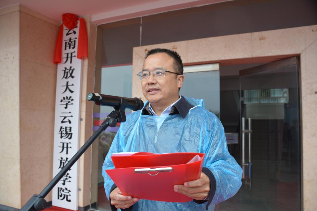云南开放大学党委书记罗国权代表云南开放大学党委和行政,对云锡开放学院的成立表示最热烈的祝贺;对给予云锡开放学院建设大力支持和帮助的省教育厅,云锡集团控股有限公司及社会各界表示最诚挚的谢意;向云锡开放学院的全体师生员工表示热烈的祝贺和衷心的感谢。