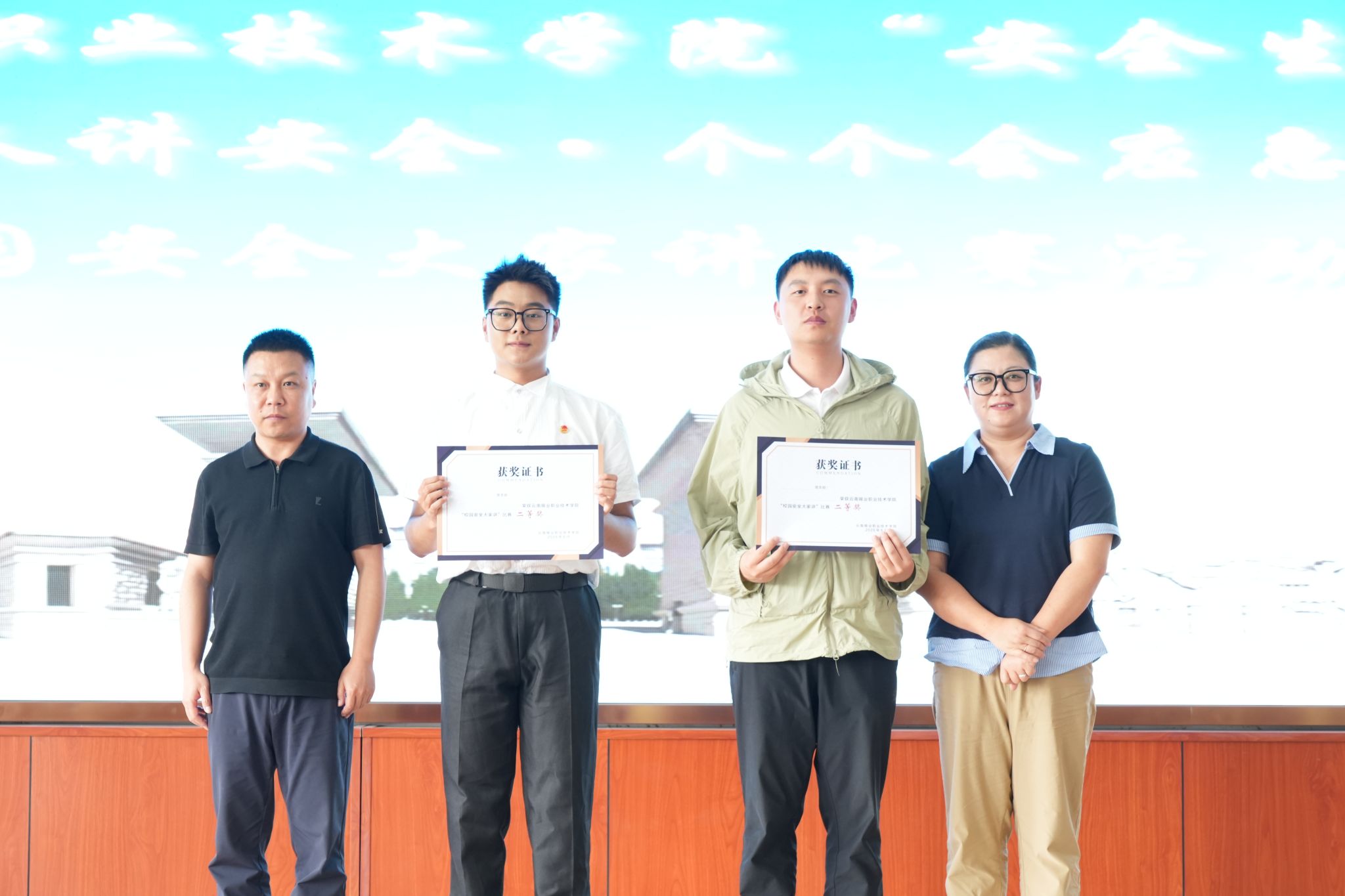 《“零门槛”漩涡:从不屑到崩溃的刷单陷阱》揭露刷单骗局从“小利诱惑”到“大额诈骗”的惯用套路,警示大学生警惕 “天上掉馅饼”的陷阱,在真实校园场景中传递防诈意识;《生命之光,共筑校园消防的铜墙铁壁》以铿锵宣讲,强调预防为主、生命至上的理念;《触电惊魂》聚焦用电安全,通过生动的情节和人物塑造,展现了在日常学习和生活中可能遇到的用电安全隐患,以及正确的应对措施……选手们聚焦网络安全、消防安全、心理安全等选题,以演讲、朗诵、情景剧、相声等形式,用声情并茂的语言生动诠释校园安全的重要性,展示才华的同时将校园安全知识深植于心。此次比赛活动有效激发广大师生学习安全知识、掌握应急技能的内生动力,有力推动安全理念内化于心、外化于行,为学院高质量发展提供坚实保障。