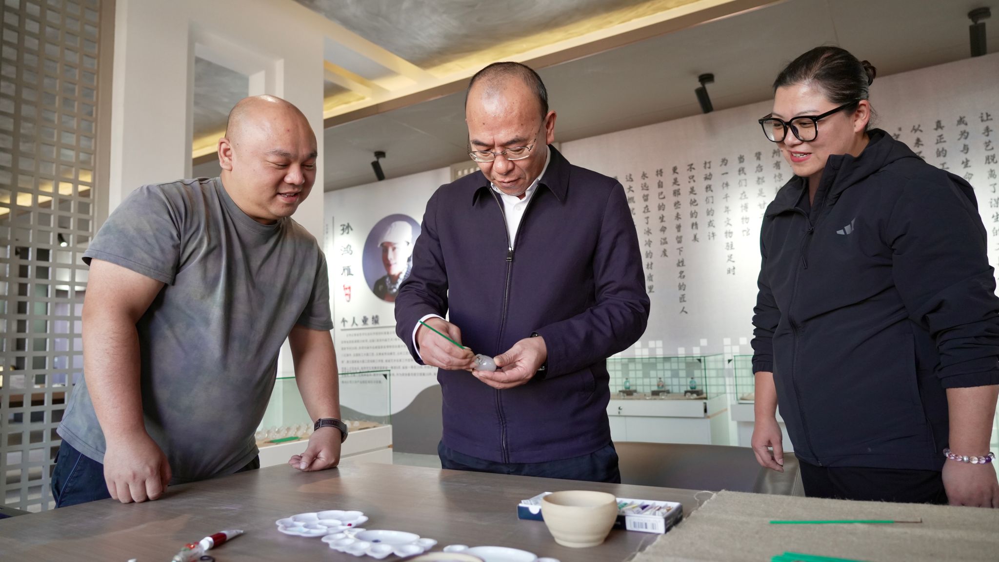 孙勇查看采矿、选矿、冶金、新材料大师(专家)工作室,参观云锡工匠馆、工艺美术学院,询问大师、工匠、能手班开展情况,聆听倪桐材、孟宪民等锡业先驱接续传承匠心、矢志投身产业报国的事迹,并实地感受锡工艺品中所凝聚的技艺和专注,体验滇派内画创作。