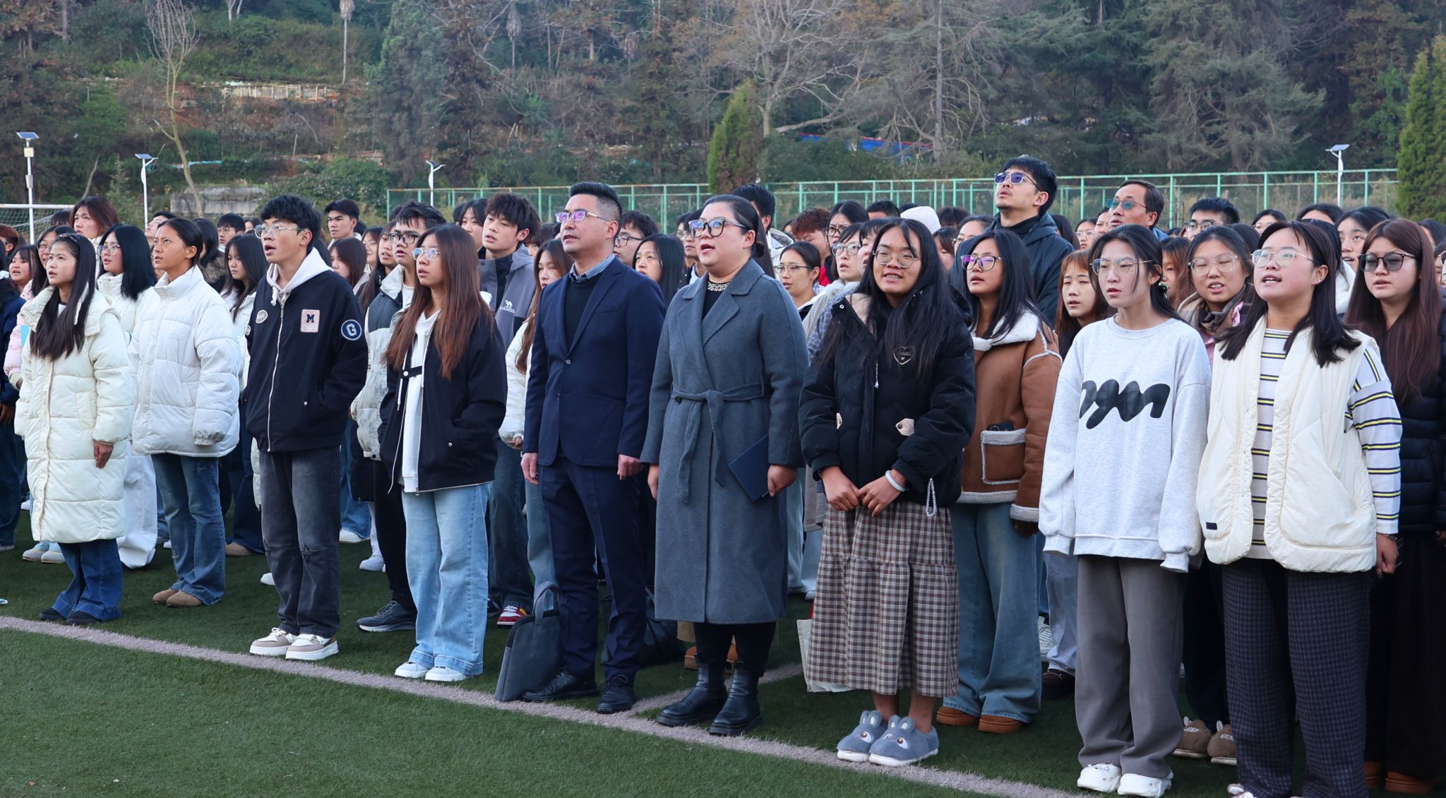 上午8时,学院国防后备连的同学们步伐铿锵,护送国旗至升旗台。在雄壮的国歌声中,鲜艳的五星红旗冉冉升起。师生们怀着崇高的敬意齐唱国歌,爱国情怀与法治信仰在晨光中交织升华。