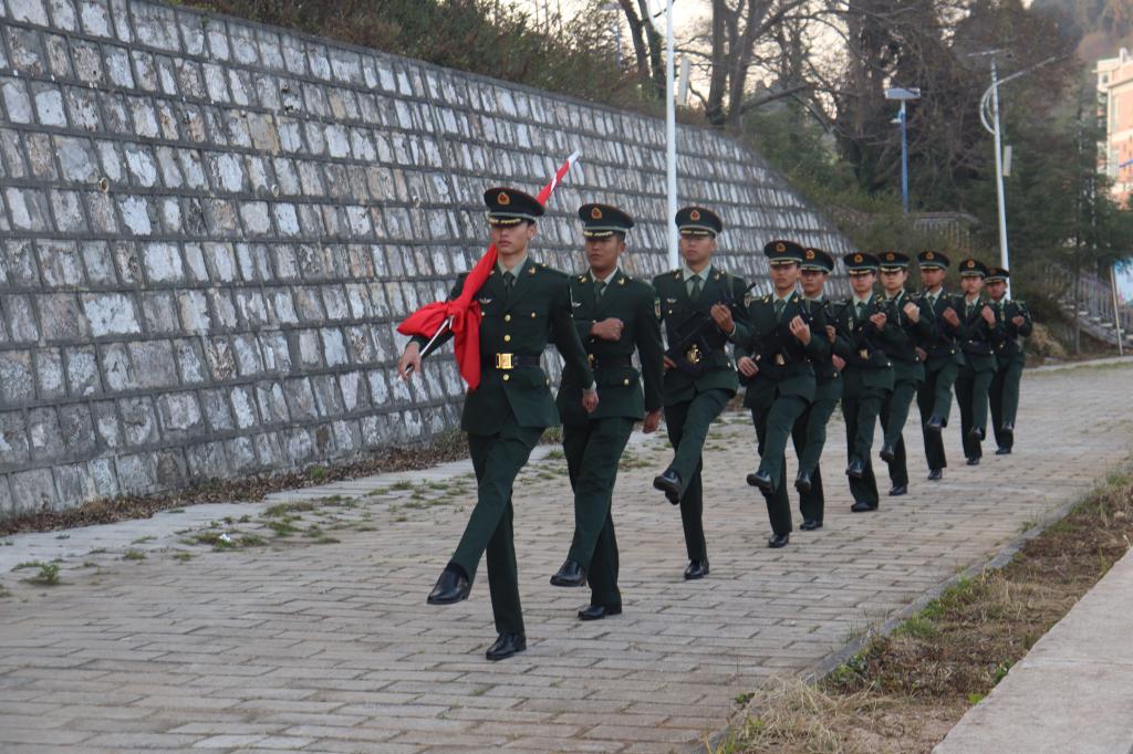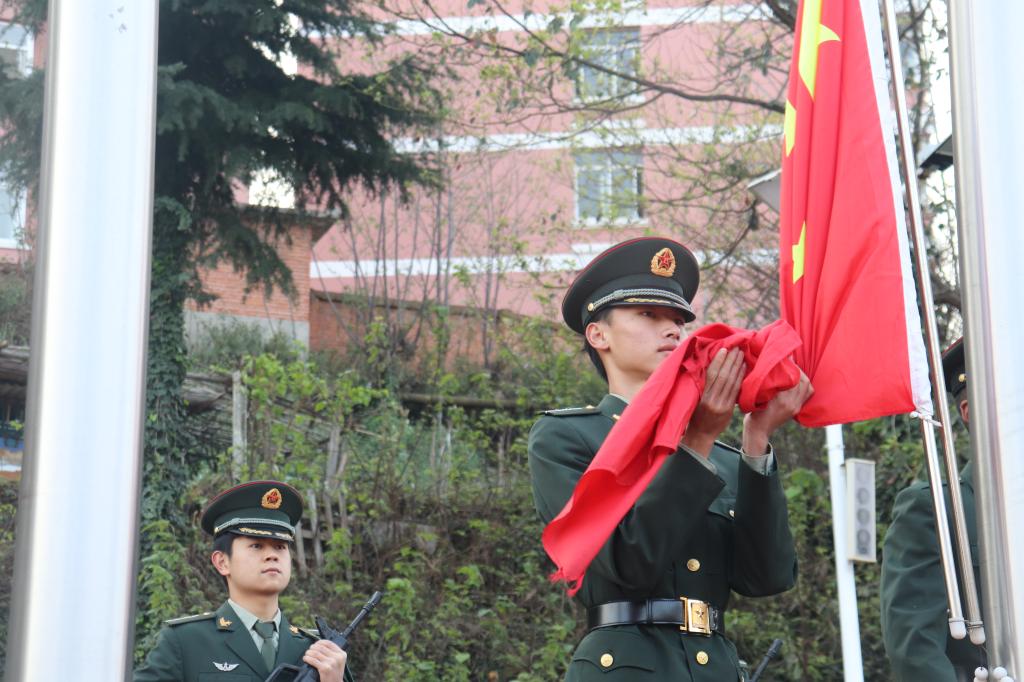 上午8点,师生们怀着崇高的敬意肃然而立,学院国防后备连国旗护卫队昂首挺胸,步履铿锵,在激昂雄壮的《义勇军进行曲》中,鲜艳的五星红旗冉冉升起、迎风飘扬,全体师生行注目礼,表达对祖国崇高的敬意和无限的热爱。