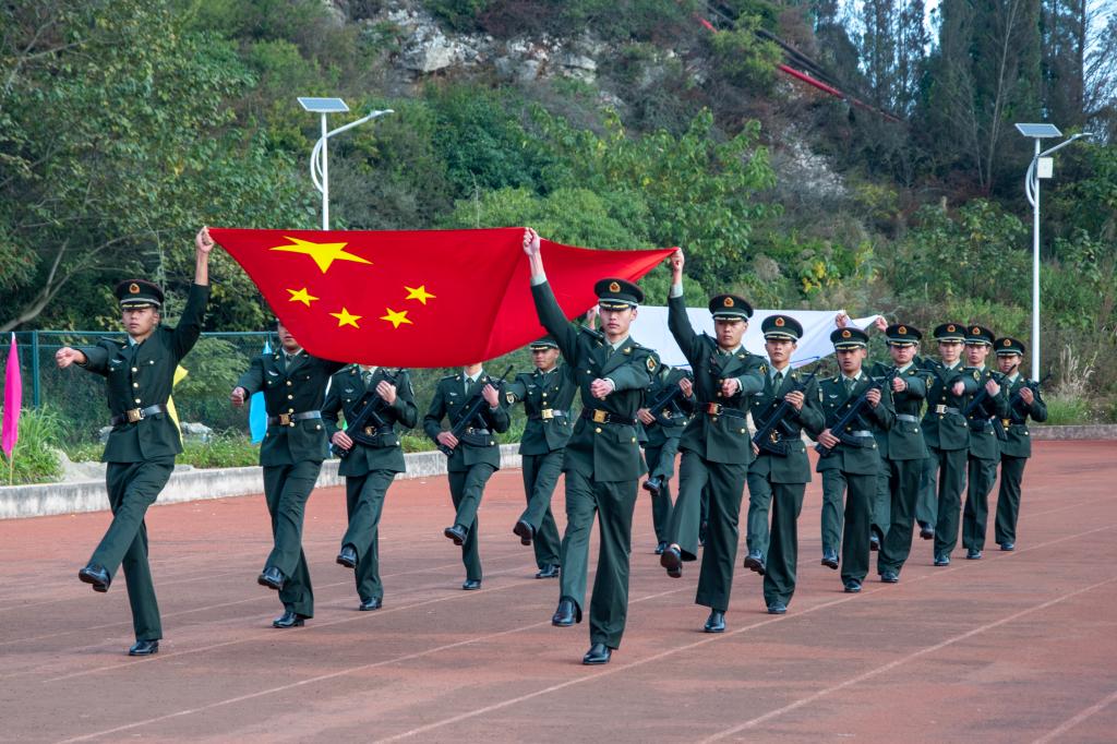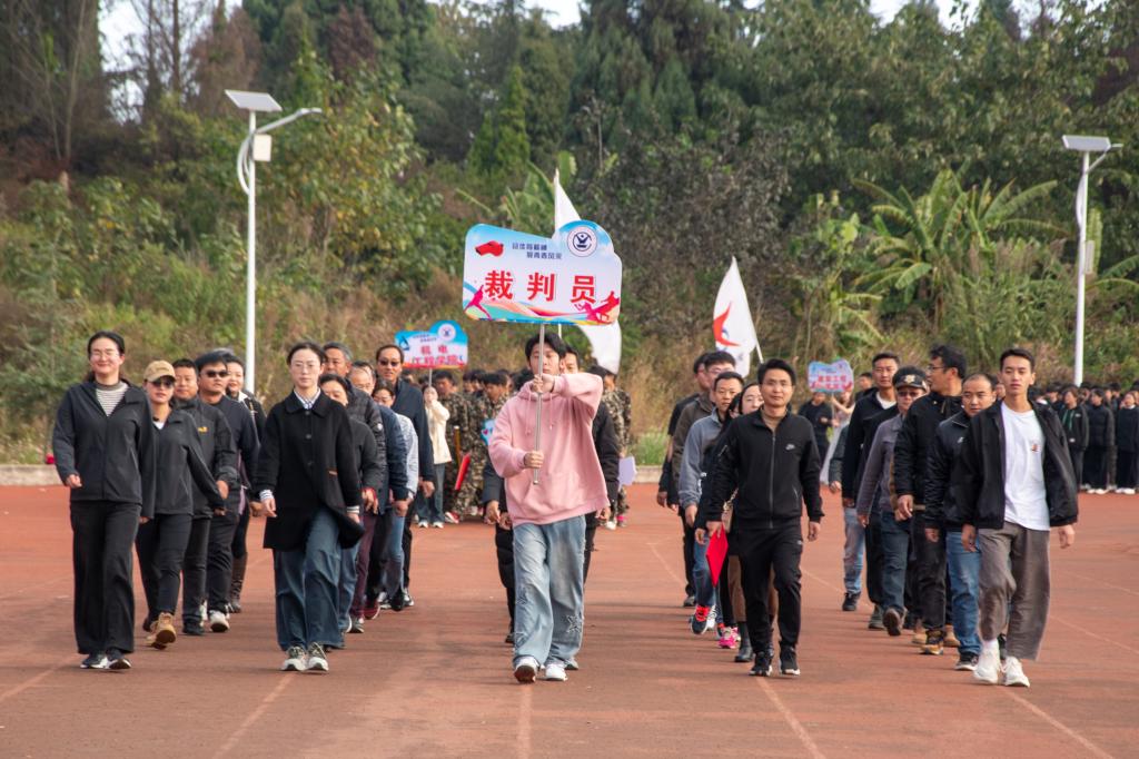 在《运动员进行曲》激昂的旋律中,英姿飒爽的护旗队迈着铿锵有力的步伐护送国旗、校旗走过主席台,各学院代表方队、裁判员代表队昂首阔步依次入场。