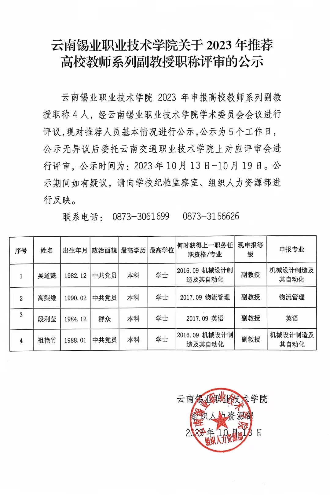 新葡的京集团8814检测站关于2023年推荐高校教师系列副教授职称评审的公示