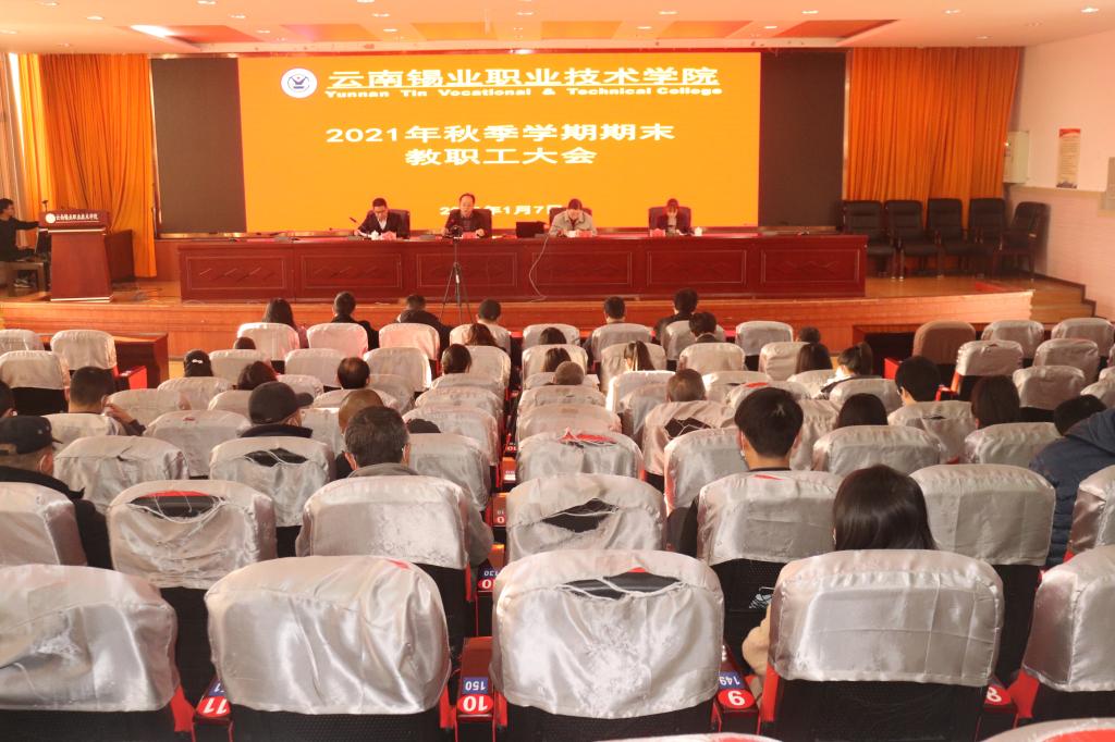 1月7日,学院在教学楼507报告厅召开2021年秋季学期期末教职工大会,安排部署寒假校园疫情防控、安全工作以及新学期相关工作。党委书记张鹏领学2021年全国职业教育大会精神,传达控股公司“两会”精神。院长李蕾总结回顾2021年工作,安排2022年工作目标,布置寒假期间疫情防控及校园安全工作。副院长张惠芬安排教学能力大赛以及教育教学相关工作。会议由副院长曲向哲主持。张鹏指出,2021年4月12日至13日,全国职业教育大会在北...