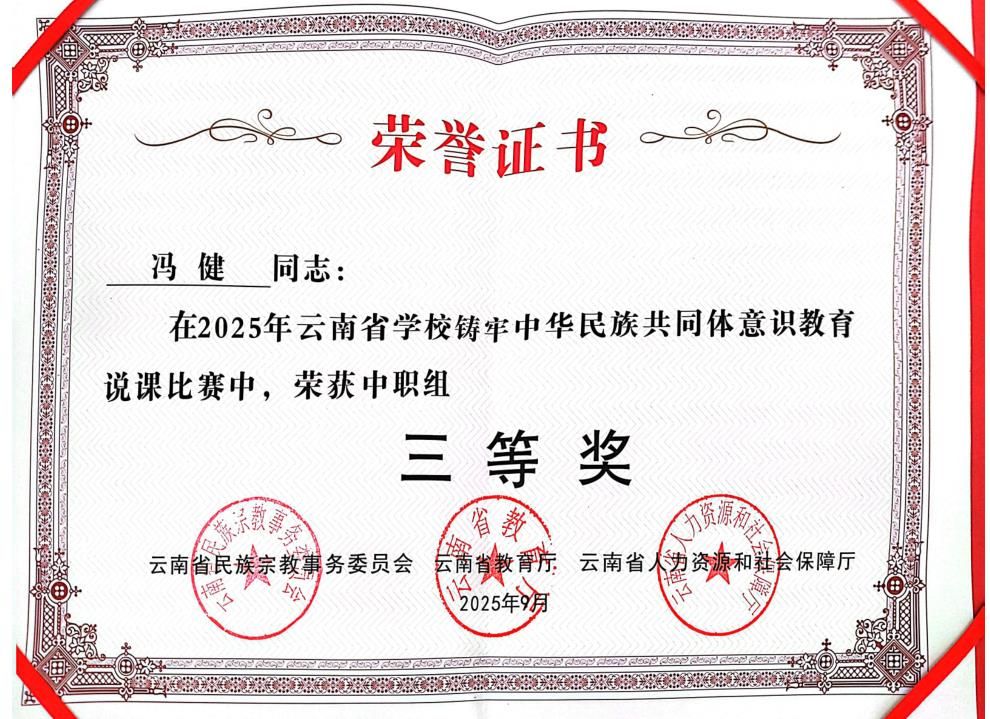 近日,由省民族宗教事务委员会、省教育厅、省人力资源和社会保障厅联合主办的2025年云南省学校铸牢中华民族共同体意识教育说课比赛圆满落幕。学院教师冯健凭借扎实的教学功底和创新的教学设计,从全省202名参赛教师中脱颖而出,荣获三等奖。学院高度重视,组织专门团队进行指导,优化教学设计,为参赛提供有力保障。比赛中,冯健紧扣主线,以生动的案例和清晰的逻辑,将宏大主题融入课堂教学,有效激发学生的认同感与归属感,展现了良好的教学风采。...